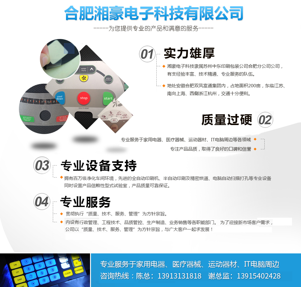 公司簡介   合肥湘豪電子科技有限公司系香港中意國際集團股份有限公司(1998年創(chuàng)建)下屬企業(yè),關(guān)系企業(yè)有:東莞中意塑膠制品有限公司(1996年創(chuàng)建),蘇州中意塑膠制品有限公司(2003年創(chuàng)建),蘇州中東包裝印刷有限公司(2007創(chuàng)建),蘇州捷瑞達自動化科技有限公司(2014年創(chuàng)建),東莞唯道實業(yè)有限公司(2014年創(chuàng)建),合肥六九機器人自動化科技有限公司(2015年創(chuàng)建);合作企業(yè)有:香港富通工業(yè)集團。   公司總部設(shè)在經(jīng)濟發(fā)達的香港,總公司這十幾年來先后在東莞,蘇州投資設(shè)廠,為滿足合肥市場廣大客戶的需求,總公司于2015年與香港富通工業(yè)集團合作在合肥投資設(shè)廠,打造電器控制面板,薄膜開關(guān)業(yè)界的航空母艦,創(chuàng)造專業(yè)產(chǎn)品,樹立精品觀念,鍛造高品質(zhì)、高服務(wù)的企業(yè)形象,樹立正確的核心價值觀。全心全意為國內(nèi)外品牌企業(yè)服...